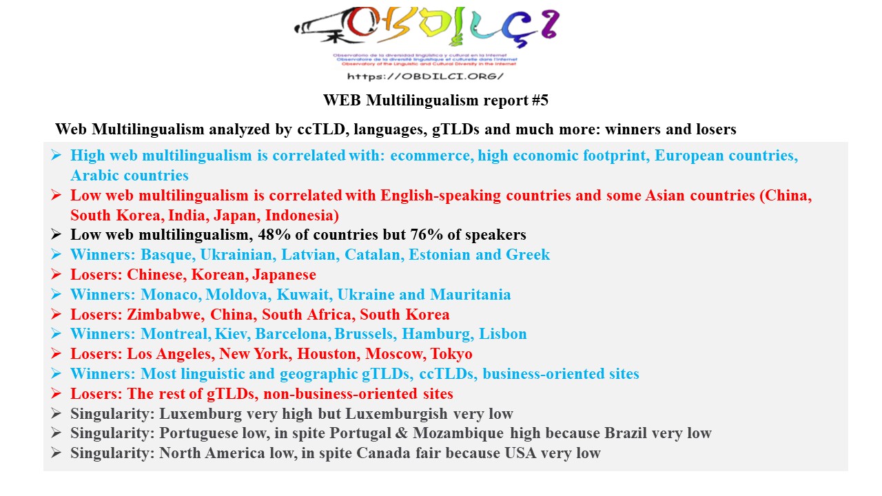 - QUINTO ESTUDO SOBRE MULTILINGUISMO DA WEBChega o quarto estudo sobre multilinguismo na Web, realizado com base no banco de dados DataProvider.com. Desta vez, o tema é: Multilinguismo na Web analisado por ccTLD, idiomas, gTLDs e muito mais: vencedores e perdedores.