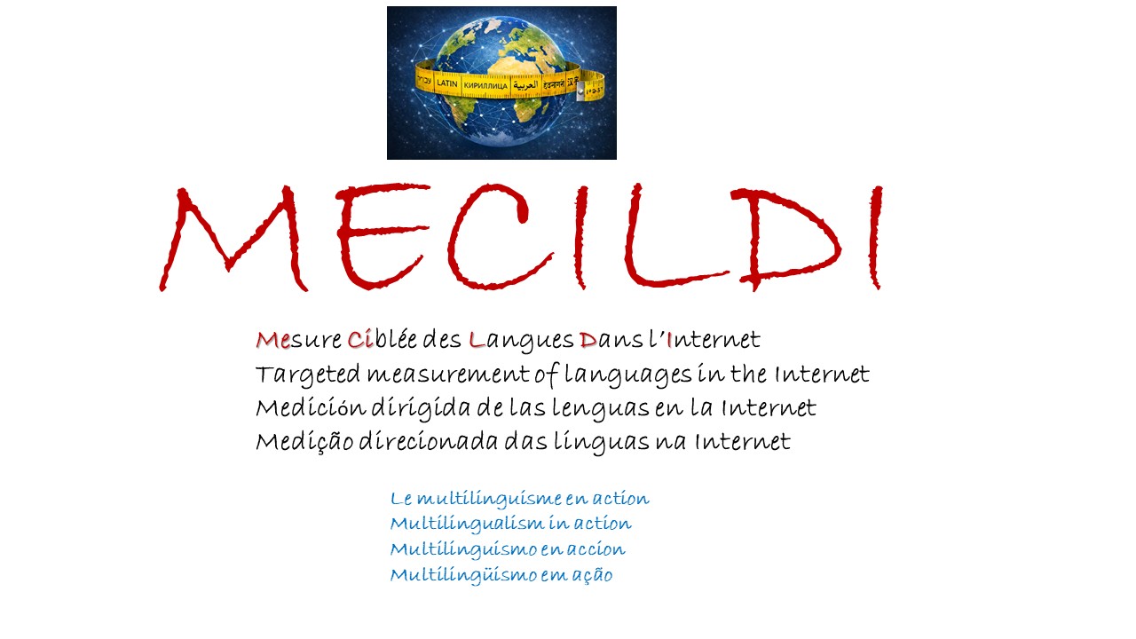 - MECILDIMECILDI Foi adicionada uma nova secção com o título PROJETO PRINCIPAL 2: MECILDI. MECILDI significa medição direcionada das línguas na Internet, a partir das suas iniciais em francês. Trata-se de um projeto novo e ambicioso baseado na criação de um programa capaz de extrair parâmetros relativos à repartição linguística e ao multilinguismo a partir de…